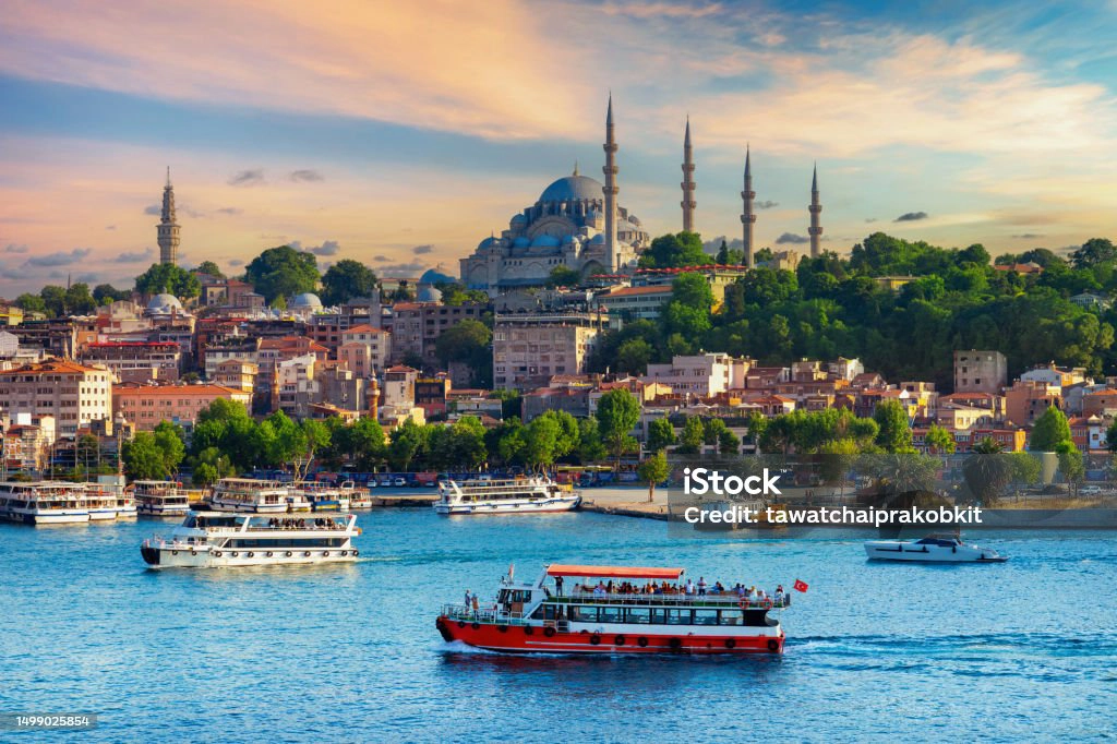 Barcos turísticos de visita guiada en la ciudad de Estambul, Turquía.
