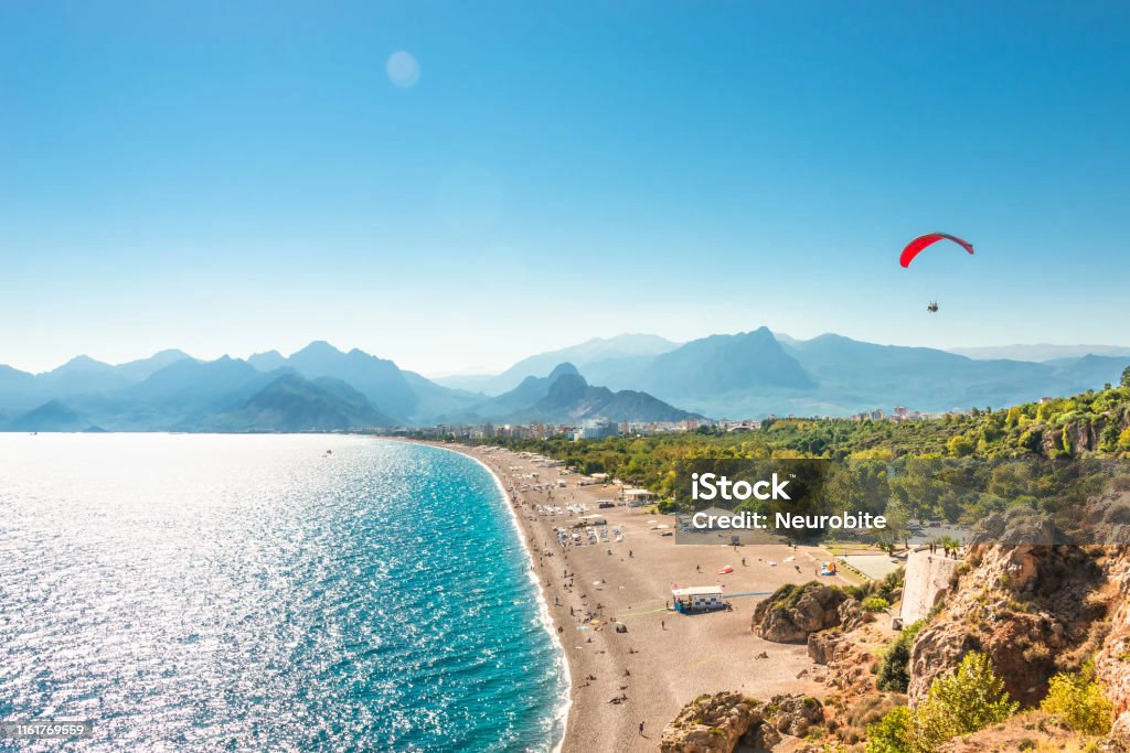Vista panorámica aérea de Antalya y la costa del Mediterráneo, y paracaidismo de montaña en la playa, Antalya, Turquía