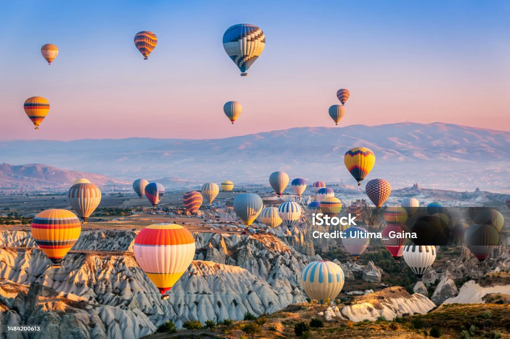 Vista aérea de una flota de globos aerostáticos en Capadocia, Turquía